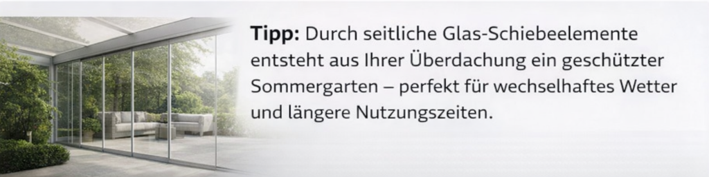 - Flexible Erweiterungsmöglichkeiten wie Glaswände, Sonnenschutz oder Beleuchtung